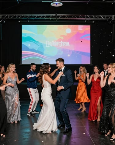 Nuestro salón principal, amplio y moderno, ideal para eventos sociales y corporativos. Su estética contemporánea, con piso y techo negros, barras y tecnología audiovisual con pantalla LED, crea un entorno elegante y versátil.